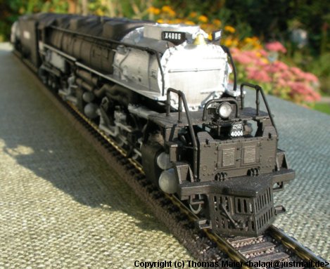 Diese Big Boy im Maßstab 1:87 entstand aus dem Revell Bausatz 02165. Das Modell wurde entsprechend der Bauanleitung gebaut und ist relativ einfach zusammenzubauen. Die "Lackierung" gestaltete sich einfach, da es große einfarbige Flächen gibt. Lackiert wurde mit Acryl-Farben und Pinsel. Vorbildinfos gibt es hier: [ Wikipedia:UP-Klasse_4000]