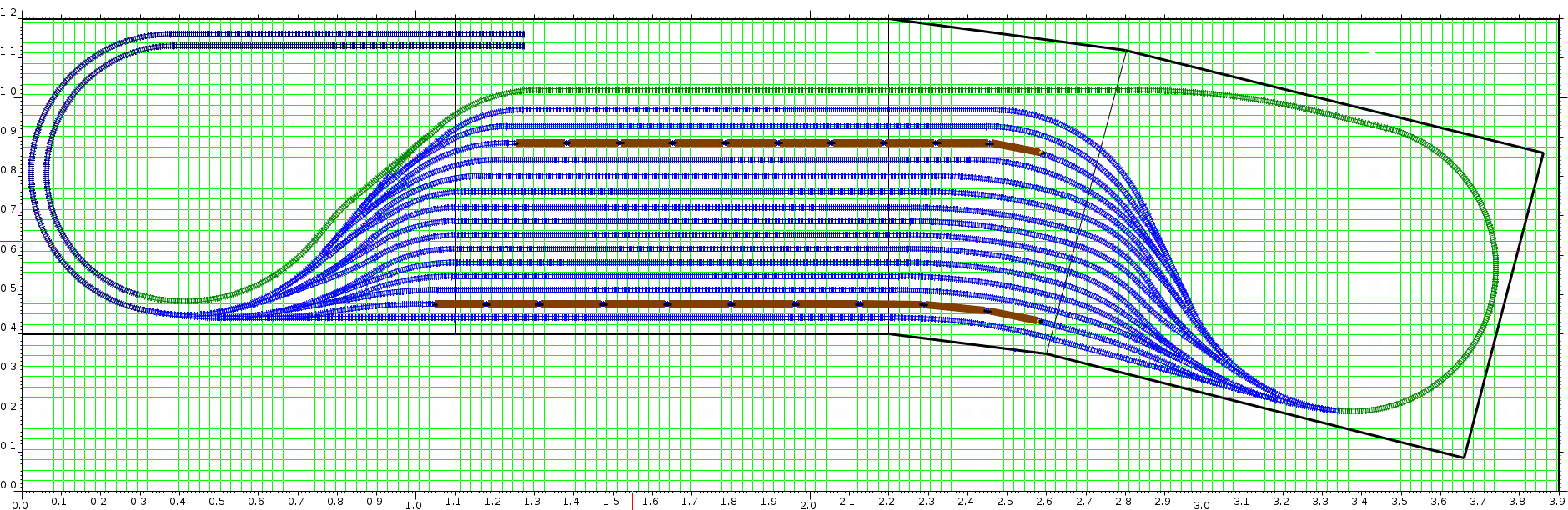 Auf einer Grundfläche von ca. 3,7m x 0.8m ist der 15-gleisige Schattenbahnhof aufgebaut. Die Grundfläche ist in 4 trennbare Module unterteilt. Für Gleise und Weichen wird Peco Finescale Code 55 Material verwendet. Der Abstand der Abstellgleise beträgt im vorderen Bereich 35mm, im hinteren 45mm. Ein Greifen der Wagen und Loks und damit gut möglich. ![]() (Klick aufs Bild zum vergrößern.) |