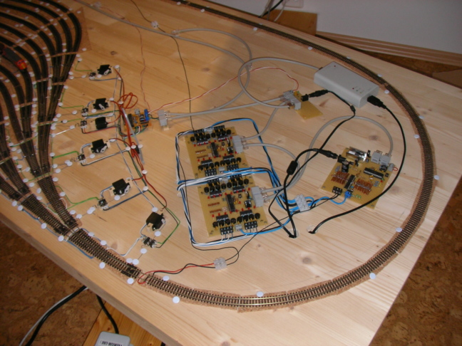 Rechte Seite mit Stellvorrichtungen, Gleisbesetztmeldern, DCC-Zentrale/Booster und PC-Schnittstelle. Die Elektronik ist Marke Eigenbau.